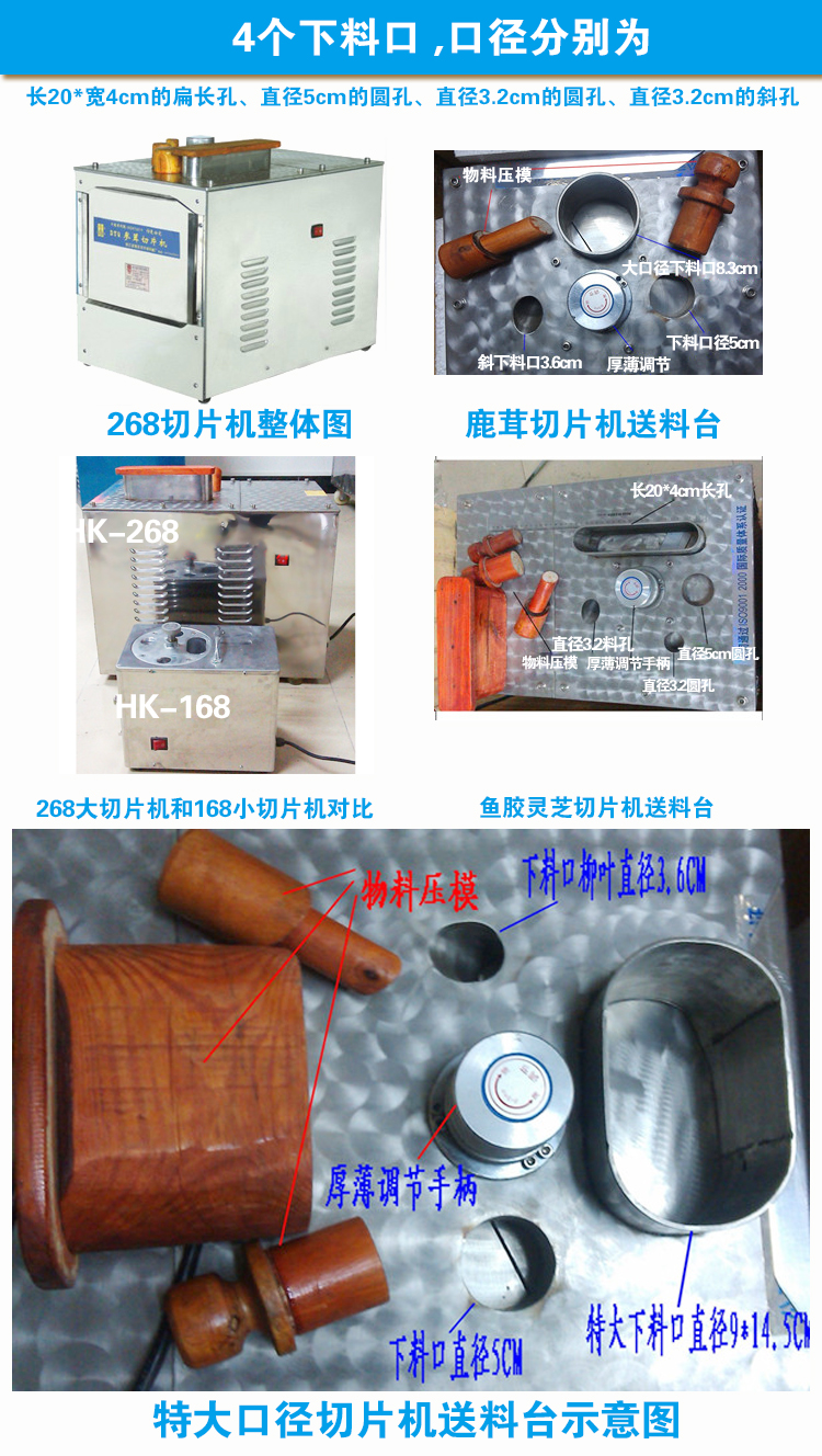 其中专门设计了一个扁长形的下料口,长度达20cm,宽度4mm,非常适合天麻的纵切片、灵芝切片和鱼胶切片。