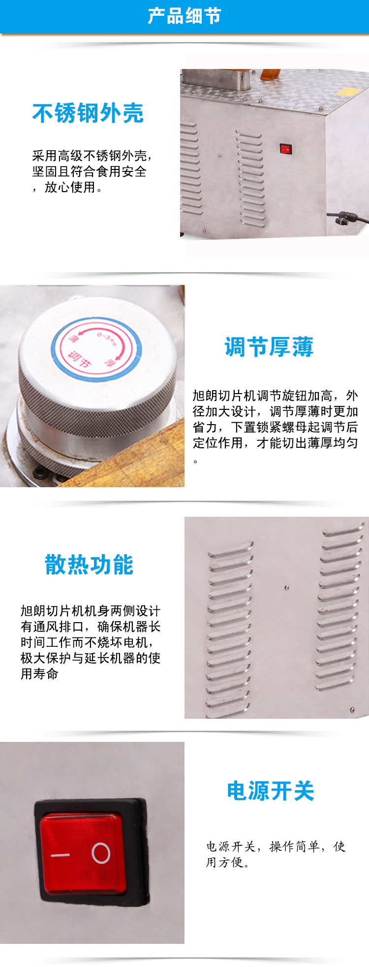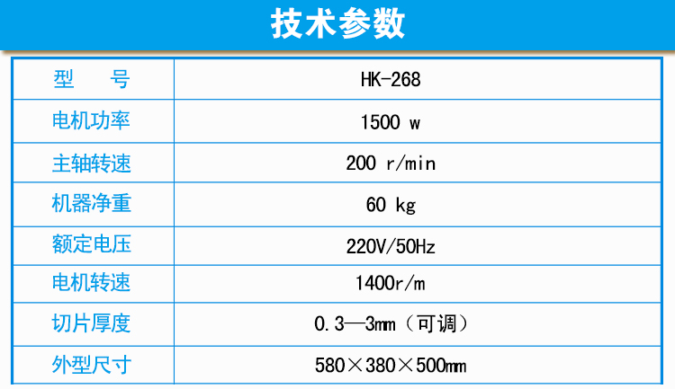 刀片四把,可任意调节厚薄、具有体积小、使用方便、切片美观、操作简单、质量稳定、使用寿命长等优点。适用于参